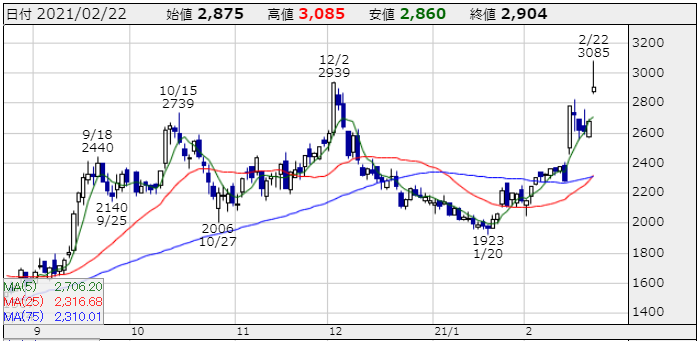 同社は発行済み株式数の100%、366万株を保有しているのですが、今回一部株式の売出を行い、所有割合は72.1%となりますが、IPO銘柄はぶっ飛ぶ銘柄が多いですし、Sharing Innovationsの業種は「システム開発ならびにクラウドインテグレーション」、SBI証券が主幹事でVCの売り玉もありませんので結構ぶっ飛びそうなIPO銘柄ですので、同社は含み益の拡大などが想定されるとの事が投資家に好感されて株価は急伸となり一時3085円まで上昇して上場来高値更新となっていいます!!