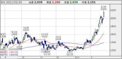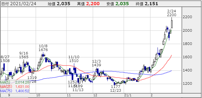 業績面はコロナ直撃ですので、2021年3月期第3四半期累計(20年4月-12月)の連結決算は、売上高が8.90億円(前年同期比77.4%減)、営業損益が5.23億円の赤字(前年同期は16.17億円の黒字)、経常損益が4.65億円の赤字、業績見通しが立たない事で株主優待の実施も見送っておりますが、とにかく需給が向いて年初来高値更新を更新を続けてチャートが抜群です!