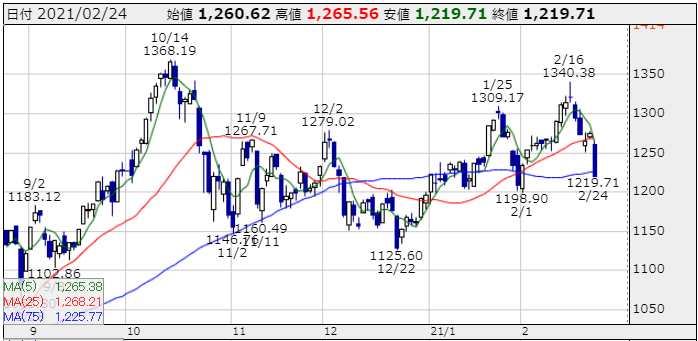新興市場のジャスダックは-0.78%ですので、マザーズは個人投資家多いので狼狽してのパニック売りという感じしています。目先は1200ポイントの辺りが直近の安値ですので割り込まずに明日は反発してほしいですね。