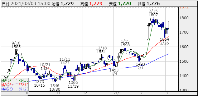 チャートを見ても2月15日の1807円をピークに下落していましたが、25日移動平均線を割り込まずに5日移動平均線上まで反発して再び高値を狙える位置となっています。貸借倍率1.13倍と空売りも多く、1800円を超えれば買戻し含め大きく上に跳ねそうです。