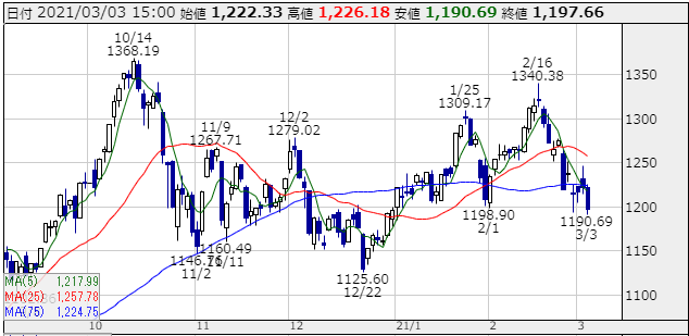 今日は後場には1190.69ポイントと1月4日につけた年初来安値の1,184.82ポイントの近辺まできていますので、割り込むとズルっと下げそうな感じありますね。