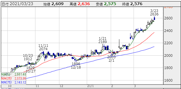本日、朝から上昇して一時は2,636円迄上昇!22日に決算発表をしたのですが、売上高は従来の1,910億円(前期比0.4%増)を据え置いた一方、国内土木と国内建築の利益率が改善当期純利益を45億円から59億円(同17.8%増)に増額となったことが好感された様ですね!