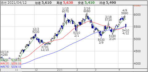 売り込まれた理由としては、東京都など3都府県で、新型コロナウイルスの緊急事態宣言に準じた措置をとる「まん延防止等重点措置」の適用もですが、今期の大幅増益見通しを発表した【6506】安川電機が22年2月期見通しは420億円で市場予想を10億円強下振れが失望売りとなり「前日比-7%の下落!!」