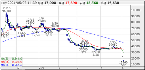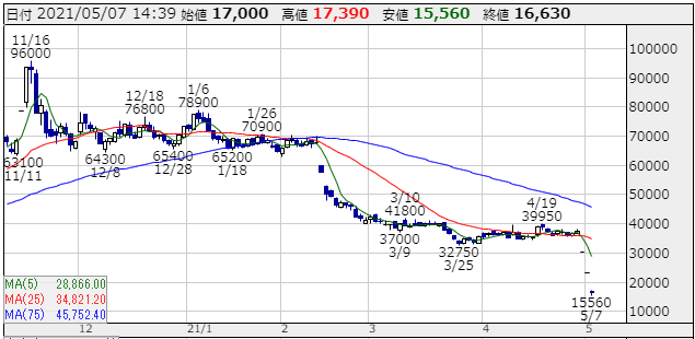 泡吹いて失神しそうな数字なわけですが、安値は1万5560円まで下落…30%を超える下げ幅…これは恐ろしい話ですよ!!