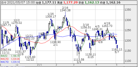 まあとは言っても全体相場が堅調でマザーズだけが下がり続けるなんて事ないと思いますので、そろそろ底は近いと思っていますが、目先は3月25日に付けた1138.11ポイント近辺という感じですかね~。
