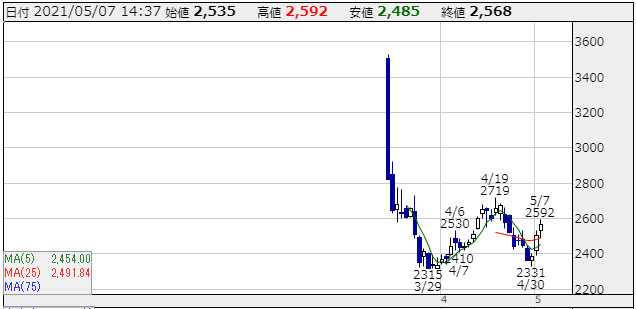 業界トップレベルの技術者が多数在籍する人材派遣会社という事からも高い注目を集めて公開価格である2120円から初値3505円と公開価格を65.3%上回る上昇となりましたが、その後は大きく値を下げておりましたが4月30日に2331円まで下落してから反発!