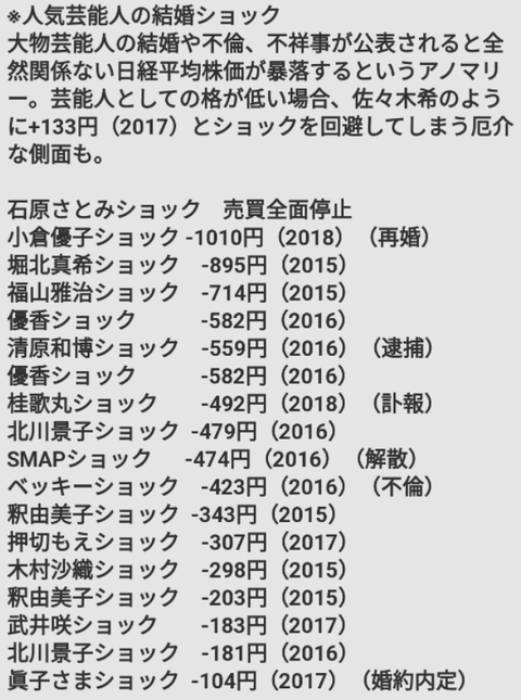 2015年の「堀北真希ショック」では895円安、「福山雅治ショック」では715円安、そして記憶に新しいものでは、「石原さとみショック」では東証のサーバーがダウンする破壊力(笑)