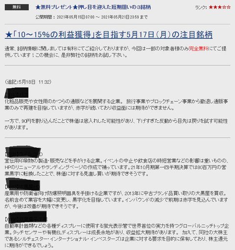 公開期間は今週中ですので、老舗投資顧問が今どういった銘柄に注目しているのか気になる方は見ておくといいですよ!