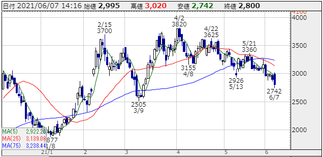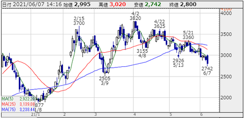 3000円まで上昇したと思ったら一瞬んにしてマイ転…空売り機関もですが、個人の売りもかなり多い銘柄入っていますので狙われたという感じですかね~。伸びきると思ったところで崩れたチャートを見ると、ちょっと厳しいのかなって感じします。
