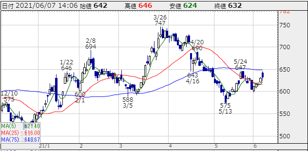 チャートを見ても5月13日につけた575円から下値を切り上げながら上昇して、前回高値647円を試す位置になっています。PER10.9倍、PBR1.44倍と割安ですので、647円を抜ければ走りそうですので、注目しています!