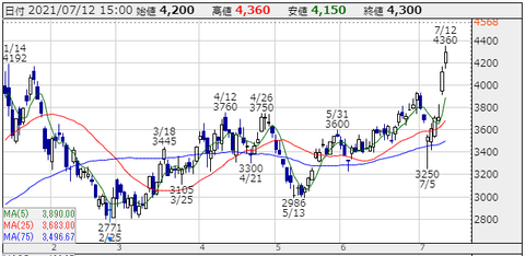 注目の再生可能エネルギー関連の銘柄からも投資家人気に火がついて株価は急伸、今年1月につけた上場来高値を超えてチャートは勢い抜群!決算が7月15日に控えていますが、市場の注目テーマの有望株ですので注目と言えますよ!