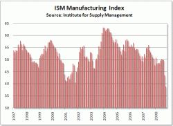 米サプライマネジメント協会(ISM)が3日発表した10月のISM製造業景況感指数は、前月より4.6ポイント下がり38.9となった。1982年9月以来、26年ぶりの低水準。好不況の判断の分かれ目である50を3カ月連続で割り込み、市場の事前予想(41.5程度)も大幅に下回った。金融危機が実体経済にも影響し、幅広い業種で景況感の悪化が浮き彫りになった。 項目別には「雇用」が34.6と前月比7.2ポイント低下した。自動車販売の低迷などで「生産」も34.1(6.7ポイント低下)と落ち込んだ。新規受注も振るわず、企業の生産や設備投資が一段と低迷していることが鮮明になった。 欧州や新興国にまで景気減速が波及し始めた影響で「輸出」は41.0と11.0ポイントの大幅な低下。個人消費の失速を映し「輸入」も41と3ポイント下がった。一方、原油価格の下落などを背景に、「価格」が37.0と16.5ポイント低下している。