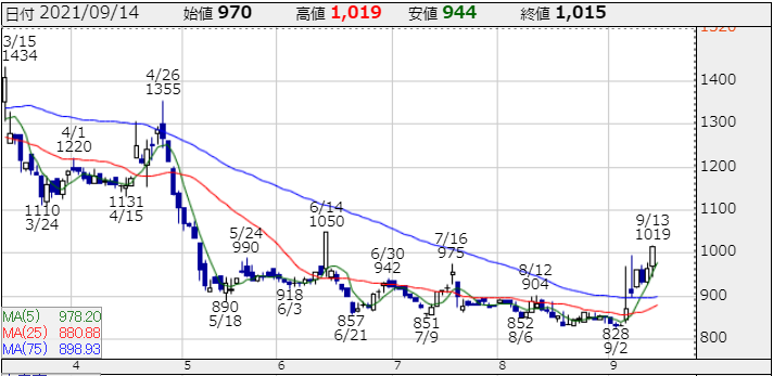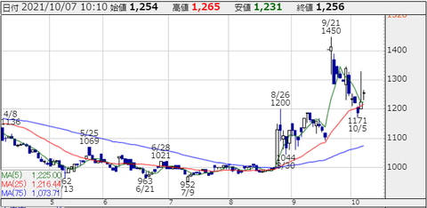 チャートは直近の急落で25日移動平均線近辺で反発。デジタル庁、DXへの注力を岸田新内閣は宣言していますので、相場になりそうな雰囲気ありますよ!