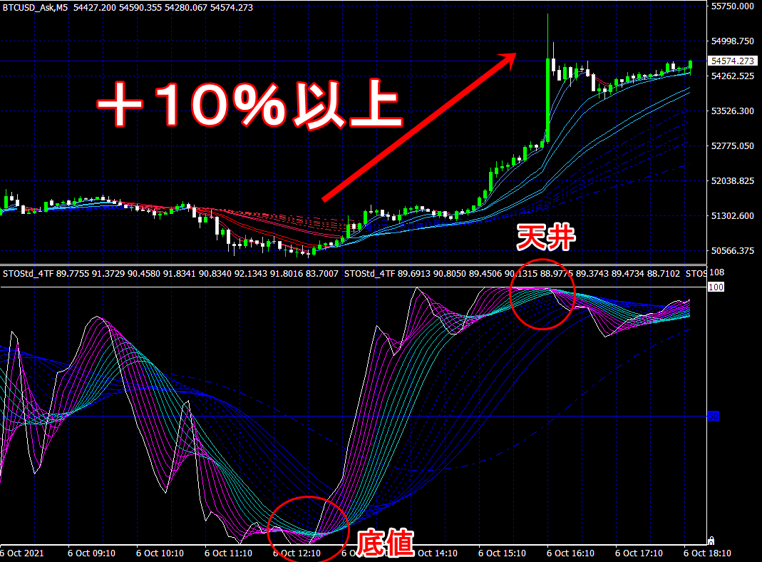 BTCUSD 5分足(10月6日)  ”たった4時間で、10%の爆上げ”