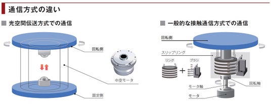 接触式スリップリングでは機械的な接点の摩耗により信号品質が劣化する課題がありますが、非接触の光空間通信のため安定したデータ通信が可能です。