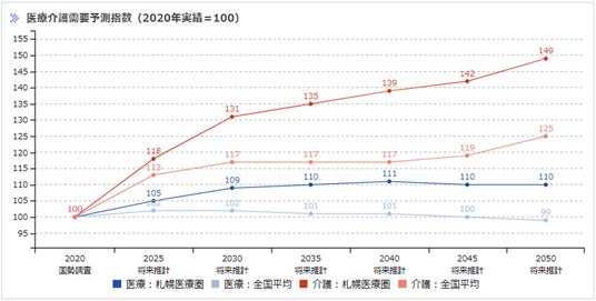 国立社会保障・人口問題研究所によると、札幌市を含む札幌医療圏では、2020年に13.7%であった後期高齢者比率が2050年には25.1%と大きく増加していくと推計されています。