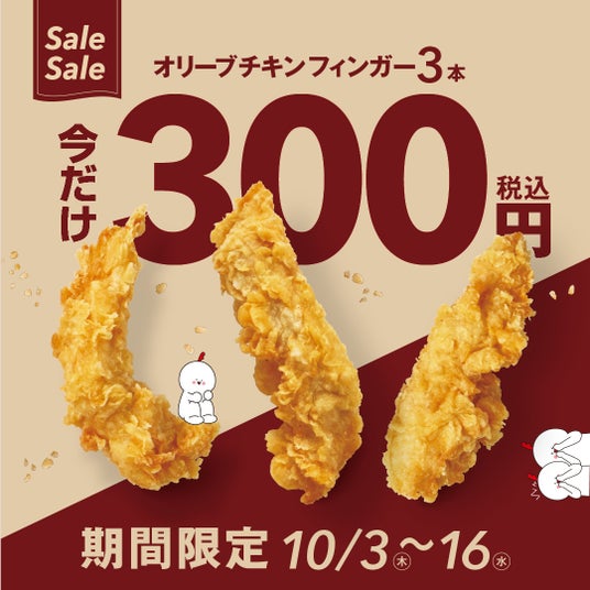 少しずつ秋らしい日が増え、だんだんとすごしやすい毎日となってまいりました。秋と言えば食欲の秋。一人でも多くのお客様に、『オリーブチキンカフェ』人気の商品を心ゆくまでお召し上がりいただけるよう、この度「オリーブチキンフィンガー3本300円キャンペーン」を実施いたします。