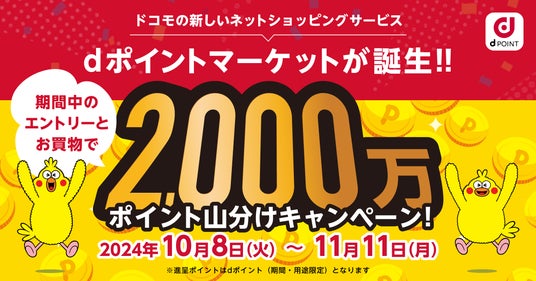 これを記念し、2024年10月8日(火)~2024年11月11日(月)に期間中の購入回数に応じてdポイント(期間・用途限定)総額2,000万ポイントを山分けする「dポイントマーケットオープニングキャンペーン」を開催いたします。