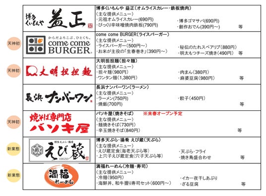 【出店テナント一覧】 ※価格やメニュー内容は変更する場合があります。