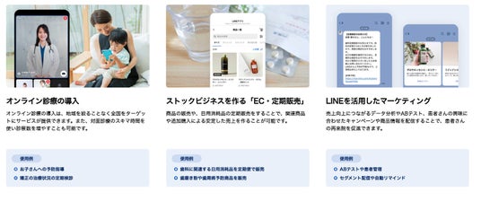 地域を絞ることなく全国をターゲットに予防指導などのサービス提供が可能な「オンライン診療」、商品や日用消耗品の定期販売をすることで安定した売上を作れる「EC・定期販売」、売上向上のためのデータ分析や患者さまの興味に合わせた新しい診療メニューの配信など「LINEを活用したマーケティング」により、患者さまとの密なコミュニケーションを実現します。