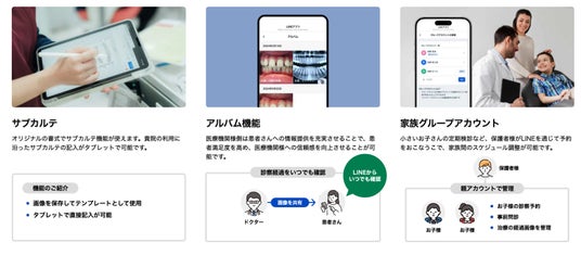 タブレット操作によるサブカルテの記入やアルバム機能で診療経過をいつでも確認できます。アルバム機能や予約は家族ごとに管理することも可能で、歯科に特化した機能も充実しています。
