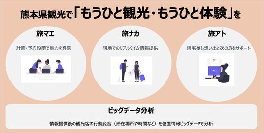 位置情報ビッグデータをもとに「旅マエ」「旅ナカ」「旅アト」の状況に合わせた複層的な情報提供することで熊本県への愛着を喚起。加えて、観光客の来訪箇所や滞在時間の変化など、情報提供による行動変容効果をデータで解析し、観光消費や地域活性化に向けた示唆を導きます。