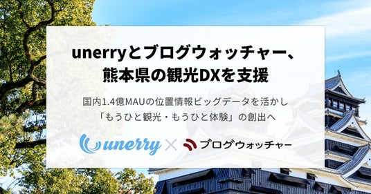 リアル行動データプラットフォーム「Beacon Bank」を運営する株式会社unerry(本社:東京都港区虎ノ門、代表取締役社長CEO:内山 英俊、以下「unerry」)は、株式会社ブログウォッチャー(本社:東京都中央区、代表取締役社長:新村 生、以下「ブログウォッチャー」)と、熊本県の観光振興のため、位置情報ビッグデータを活用した情報発信による観光誘客、回遊促進および来訪者分析などのご支援を始めました。