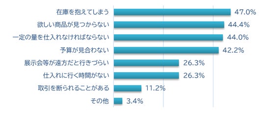 ・仕入れに関して半数以上(53.8%)が課題を感じており、特に「在庫を抱えてしまう」「欲しい商品が見つからない」「一定の量を仕入れなければならない」といった理由が多い。