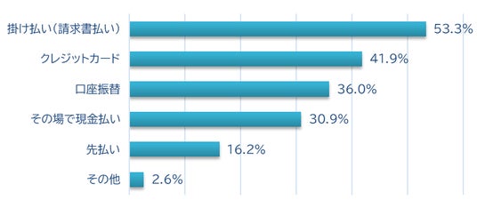 (5)現在利用している決済方法は「掛け払い(請求書払い)」が最多で半数以上(53.3%)を占める。
