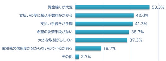 ・仕入れの際の決済方法についても課題を感じる人が33.6%。特に「資金繰りが大変」が最も多く53.3%、次いで「支払いの度に振込手数料がかかる(42%)」、「支払い手続きが手間(41.3%)」「希望の決済手段がない(38.7%)」となった。