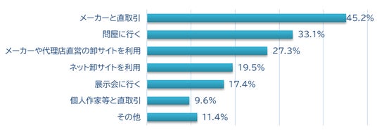 ・仕入れの手段としてはメーカーとの直取引が45.2%と最も多く、次いで問屋が33.1%、メーカーや代理店直営の卸サイトが27.3%となった。