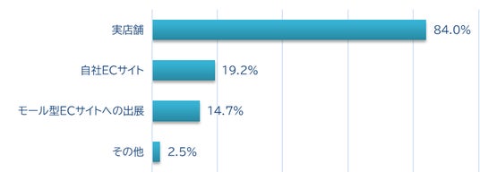 今回の回答者のお店の業態は実店舗が最も多く全体の8割超、その他自社ECサイト19.2%、モール型ECサイトへの出展14.7%、その他2.5%となっています。