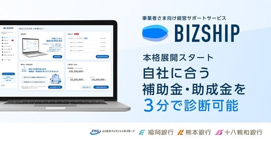 株式会社ふくおかフィナンシャルグループ(取締役社長 五島 久)は、事業者さま向け経営サポートサービス「BIZSHIP」(以下「BIZSHIP」)において、福岡銀行で試行提供していた「補助金・助成金診断」機能を、より利便性を高めるとともに熊本銀行と十八親和銀行でも提供を開始したことをお知らせします。