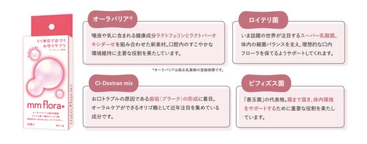 健康志向が高まる中、腸内環境を整える「菌活」ブームが拡大しています。「mm flora*」は、お口の“菌活”に着目し、乳酸菌などの善玉菌を配合。