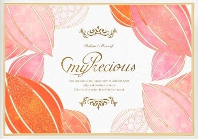 カカオをピンクのグラデーションカラーで表現した大人かわいいデザイン。サイドはゴールドのダマスク柄で高級感を演出しています。