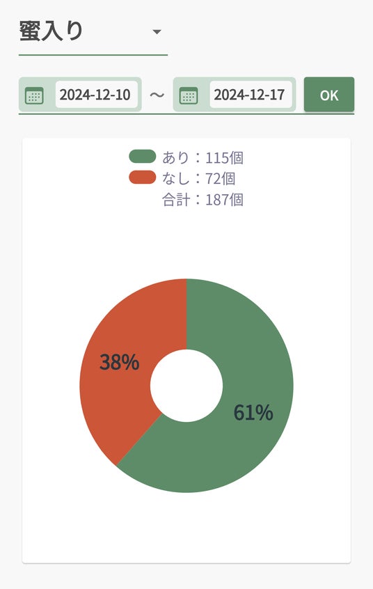 「りんご向けコンパクト選果機」とスマートフォンをBluetoothで接続することで、選果機から送信された蜜判定・褐変判定・糖度判定などのデータを専用アプリで分析することが可能です。蜜・褐変は「あり/なし」で表示され、糖度は数値で表示されます。得られた選果結果はクラウド上に保存され、専用アプリ上でグラフ化されるため、利用者は選果状況の実績をリアルタイムで可視化して確認することができます。