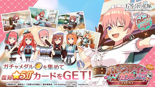 株式会社enish(本社:東京都港区、代表取締役社長:安徳 孝平、以下enish)は、2025年2月21日(金)より、アニメ「五等分の花嫁」初となるゲームアプリ『五等分の花嫁 五つ子ちゃんはパズルを五等分できない。』にて、週刊少年マガジン編集部完全監修のゲームオリジナルストーリーをお楽しみいただける復刻イベント「五つ子ちゃんのバレンタイン(ハート)カフェ~甘いだけじゃないチョコミントの味~」を開催いたします。