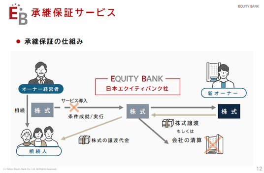 日本エクイティバンクは、「全ての現役オーナー経営者がやり切るために不可欠な存在で在り続ける」をパーパスに掲げ、現役オーナー経営者のための「承継保証サービス」を提供しています。会社の承継/売却/廃業に際して伴う様々なリスクや負担を同社が引き受けることで、ご家族を含めて現役オーナー経営者が安心して経営を続けられる環境をご提供します。