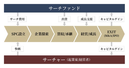 サーチファンドはサーチャーが自分の強みを活かすことができる承継先を発掘し、承継先候補の代表と密にコミュニケーションする過程で事業を深く理解し、事業成長計画を立て、承継後に経営者として事業成長を実現する仕組みです。