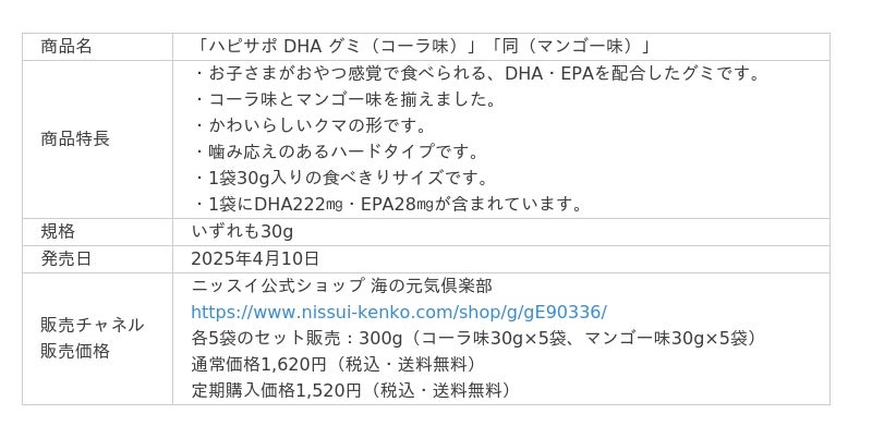 株式会社ニッスイ(代表取締役 社長執行役員 浜田 晋吾、東京都港区)は、お子さまの健康や成長に大切な栄養素であるDHA・EPAがおやつ感覚で手軽に摂れる「ハピサポ DHAグミ」を、ニッスイ通販の公式ショップで4月10日より発売します。