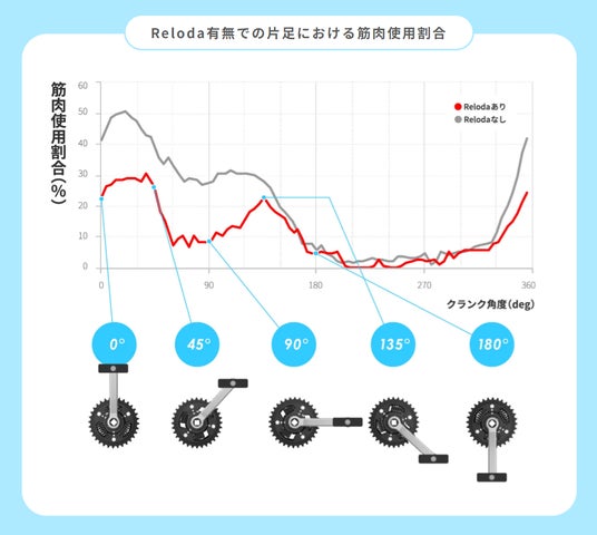 Relodaを取り付けた自転車と取り付けていない自転車を実験参加者に漕いでもらい、ペダルを漕ぐときの筋肉の使用状況を解析。比較・評価を行った結果、Relodaによって筋肉使用割合が最大20ポイント低減され、身体への負荷を軽減する効果があることが実証されました*。