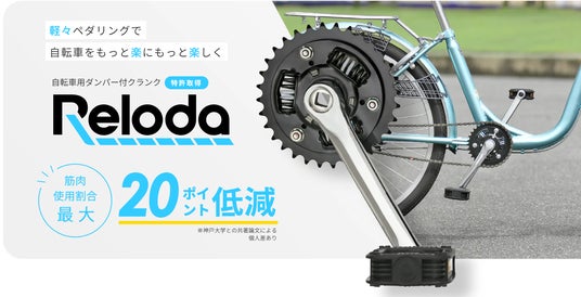マニュアルクラッチやトルクコンバータ、その他、建設・産業機械用製品、二輪車用クラッチなどの駆動系部品を、世界25ヶ国で生産・販売をしている、株式会社エクセディ(本社:大阪府寝屋川市 代表:吉永徹也 東証プライム上場 以下エクセディ)は、自転車のペダリング(ペダルを漕ぐ動作)における筋肉使用割合を最大で20ポイント低減し、負担を軽減する駆動系パーツ『自転車用ダンパー付クランク「Reloda」(リロダ)』(以下Reloda)を発表いたします。