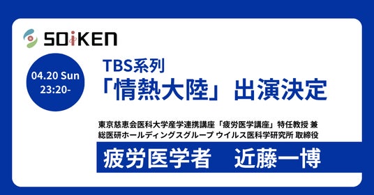 株式会社総医研ホールディングス(本社:大阪府豊中市、代表取締役:角田 真佐夫)は、東京慈恵会医科大学疲労医学講座特任教授であり、当社グループ株式会社ウイルス医科学研究所 取締役の近藤一博氏が、2025年4月20日(日)23時20分~放送予定のTBS系列ドキュメンタリー番組『情熱大陸』に出演することをお知らせいたします。