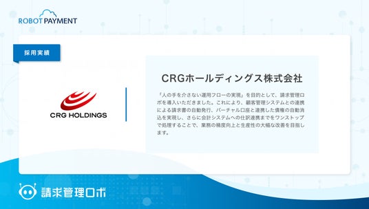 企業のお金の流れを円滑にし、新たな価値創造を促進する株式会社ROBOT PAYMENT(本社:東京都渋谷区、代表取締役:清久 健也、証券コード:4374、以下「ROBOT PAYMENT」)は、請求・債権管理システム「請求管理ロボ」が、CRGホールディングス株式会社(以下「CRGホールディングス」)に採用されたことをお知らせします。