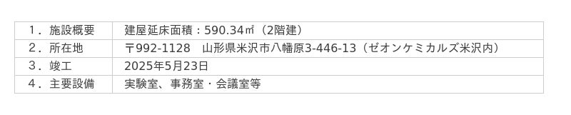 日本ゼオン株式会社(本社:東京都千代田区、代表取締役社長:豊嶋 哲也 以下、ゼオン)は、この度ゼオンケミカルズ米沢株式会社(山形県米沢市、代表取締役:渡邉 和紀)敷地内に、植物原料由来の原料製造プロセス開発を行う研究棟を新設しました。本設備では、合成ゴムの主原料であるブタジエンやイソプレンを植物原料から直接生産するバイオ技術の開発を推進し、資源循環型社会の実現を目指します。