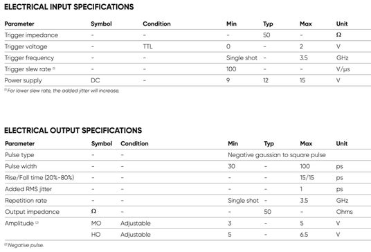 「EPG-LAB-30ps」は、パルス幅30~100 ps、15ピコ秒の立ち上がり・立ち下がり時間、繰り返し周波数最大3.5 GHz、最大6.5 Vの増幅に対応した外部トリガー対応のパルスジェネレータです。内蔵RFアンプを搭載し、LiNbO₃変調器の駆動にも適した高性能設計となっています。