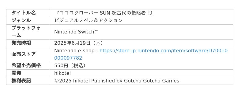 このたび、株式会社KADOKAWAのグループ会社である株式会社Gotcha Gotcha Games(本社:東京都千代田区、代表取締役社長:成田聖)より、2025年6月19日(木)に、『ココロクローバー SUN 超古代の侵略者!!』をニンテンドーeショップにて発売させていただきましたこと、及び発売記念セールを開催することをお知らせいたします。