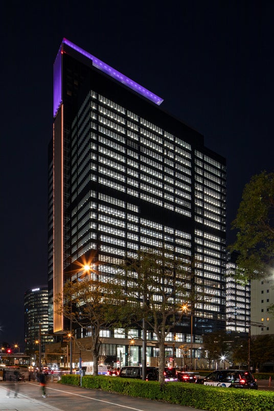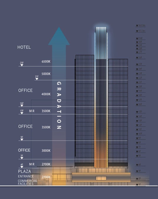 今回の照明設計では、低層部には憩いの場になるよう、温かみのある光色の照明で構成し、高層部は周辺のオフィスビル群と強調する白色の光で構成することで、都市の景観計画に合わせた照明設計を実施しています。