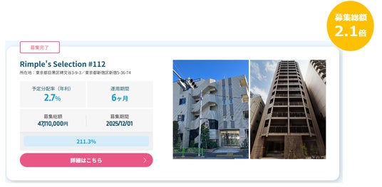 プロパティエージェントの展開する不動産クラウドファンディングRimple’s Selection#112募集総額211.3%の9,954万円の応募