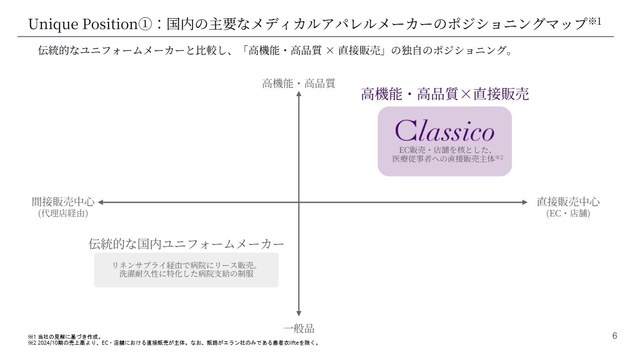 大和:おっしゃるとおり、まず直接販売が1つの大きな要因だと思っていますが、もう1つ、ブランド力も挙げられます。先ほど価格帯の話をしましたが、他社と比較して、スクラブで2倍弱、白衣で5倍以上という高価格帯でも「買いたい」と言ってくださるお客さまがいます。これが高い粗利率の要因になっていると考えています。